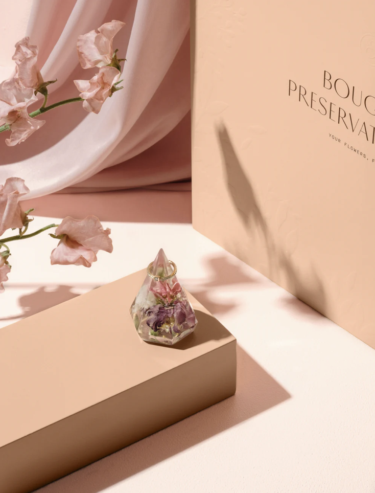 Before you hand off your bouquet to a preservation artist, it’s crucial to know the steps required to keep your flowers in the best condition. Consult with your chosen artist ahead of time to understand how to care for your bouquet from your wedding night until it’s time for preservation! Proper care ensures that your flowers maintain their beauty and integrity, making the final preserved piece as stunning as possible. We always provide our clients with a bouquet vase at their reception. This not only ensures your bouquet is safely displayed for everyone to admire, but also keeps it hydrated throughout the evening and for days after your wedding!