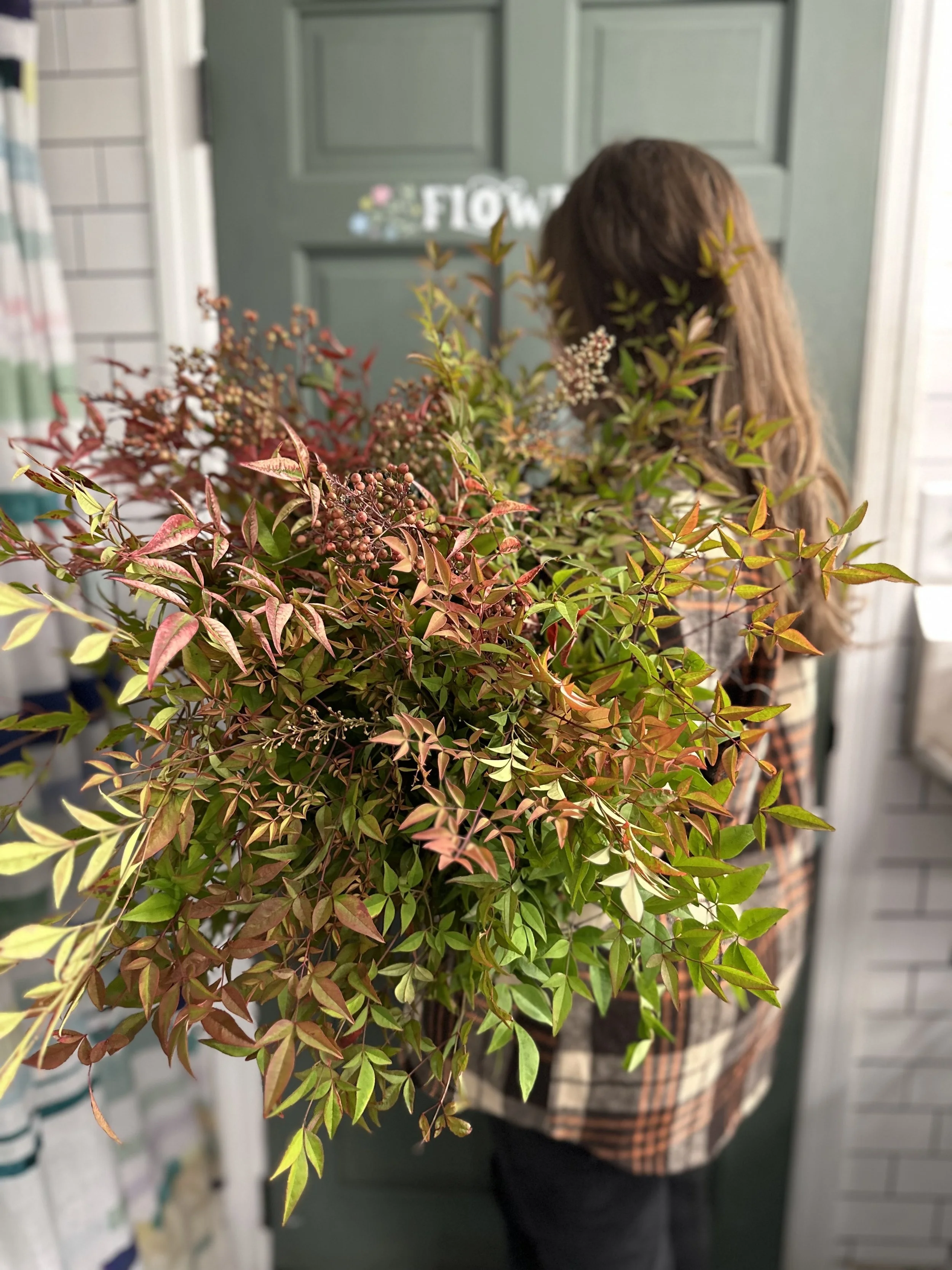 Nandina, also known as heavenly bamboo, is one of our go-to fall choices for its smaller leaves that transition beautifully through the season. The leaves start out green but develop red and orange tips, creating a rich, painterly effect. Nandina's smaller, airy leaves make it perfect for adding a delicate, seasonal touch to bouquets and boutonnieres without overpowering other elements. Its compact leaves are ideal for any arrangement where a softer, textural addition is needed. Often times it will come with a few berries which are very cute!