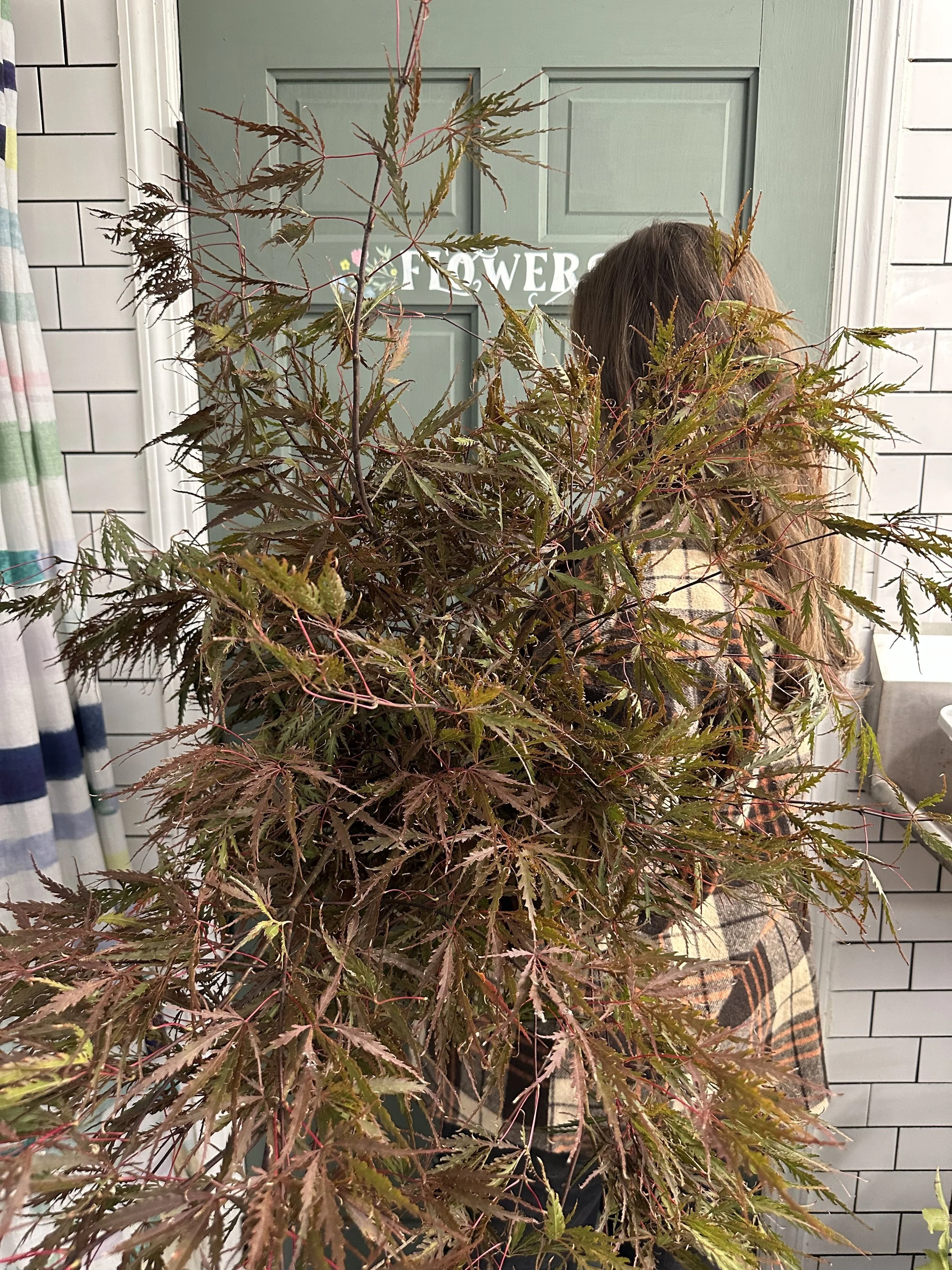 For a more dramatic, moody look, Japanese maple is stunning with its deep burgundy leaves and delicate, intricate shape. The fine leaves add a sense of movement and a touch of elegance to any design. Japanese maple can be used alone for a minimalist, sculptural piece, or layered into fuller arrangements for a burst of color that leans into fall's moody, sophisticated tones.