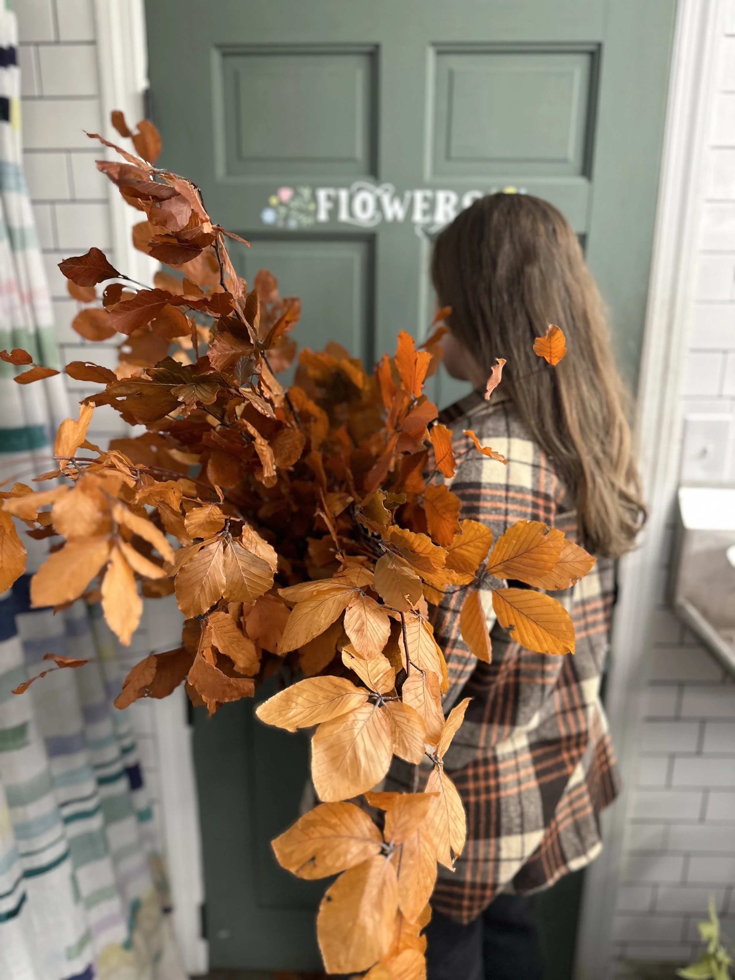 Copper beech is a preserved branch that brings an intense pop of orange (or brown, if you prefer a more subtle tone) to arrangements. This branch adds striking color and is especially easy to work with. Since it’s preserved, copper beech is best kept out of water to maintain its look—otherwise, the leaves might curl. Because it’s been treated with dye, it’s also best to avoid placing it in water, as the dye can leach and discolor the water. Copper beech is an easy way to add autumn warmth and durability to arrangements, making it a great choice for long-lasting displays.