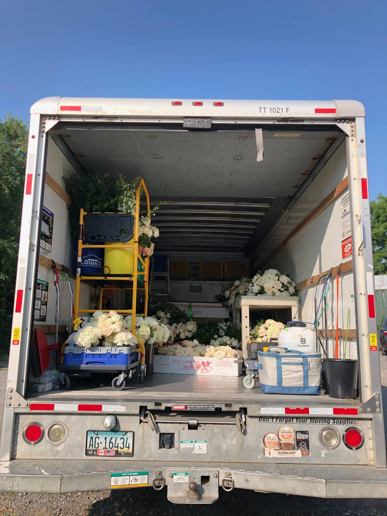 12:30pm- We finish loading all of the carts, ladders, arch, stands, hard goods and flowers on the truck and we head to the venue!