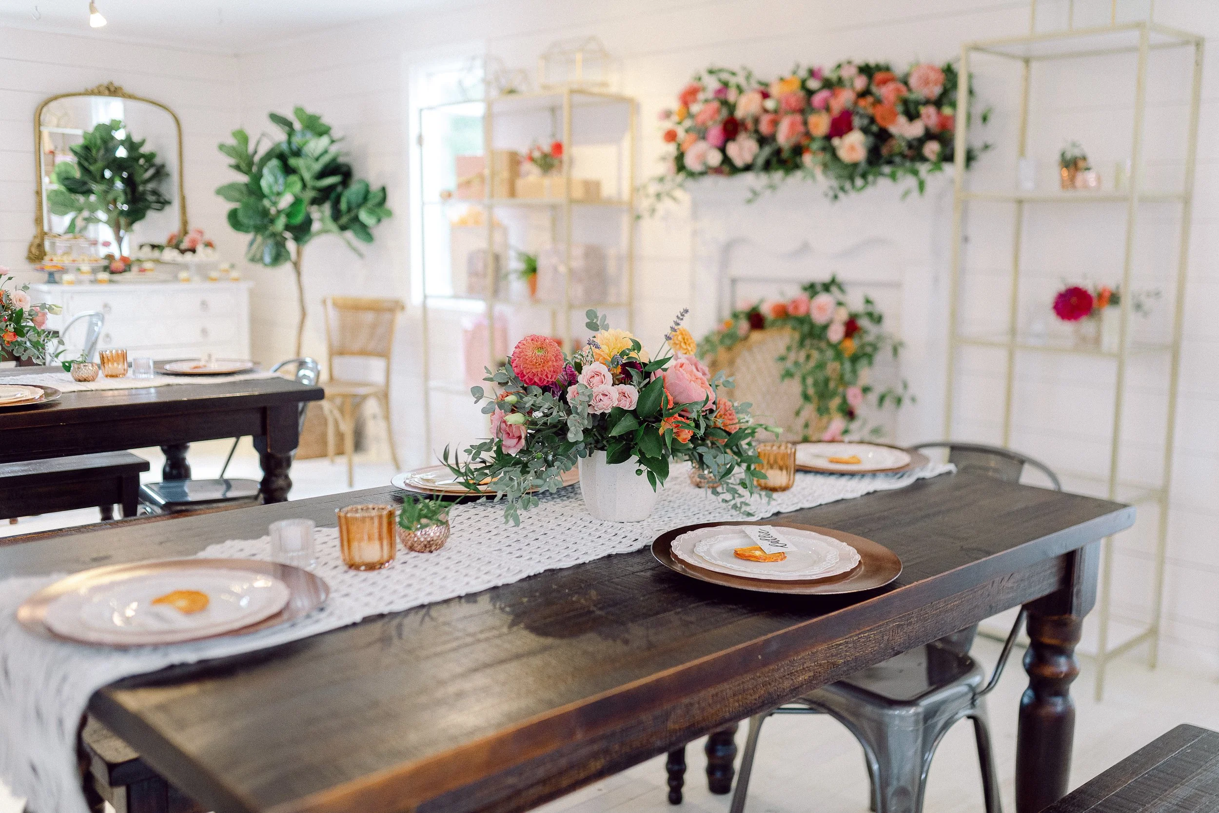 You can add our flower bomb package onto any rental! We turn the cottage into your floral wonderland, all you need to do it tell us your color scheme and we take care of the rest! The flower bomb includes centerpieces, mantle arrangement, chair flowers, loose flowers for your food and dessert display, floral ice cubes and a flower crown for the guest of honor.